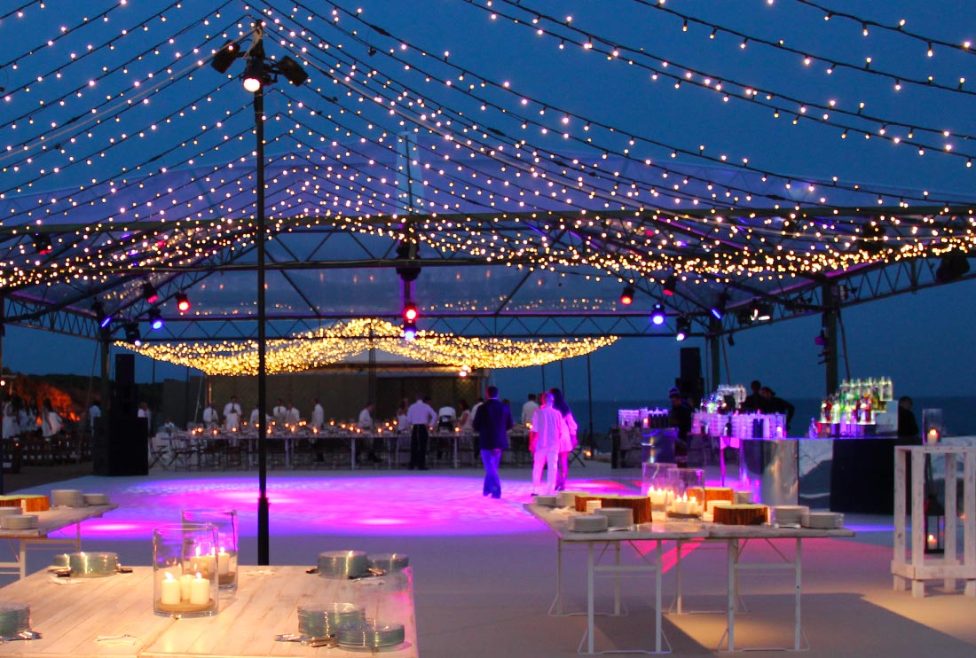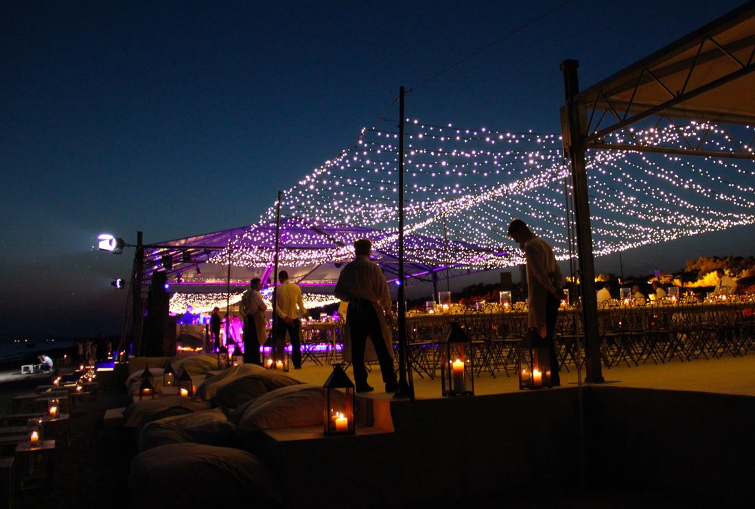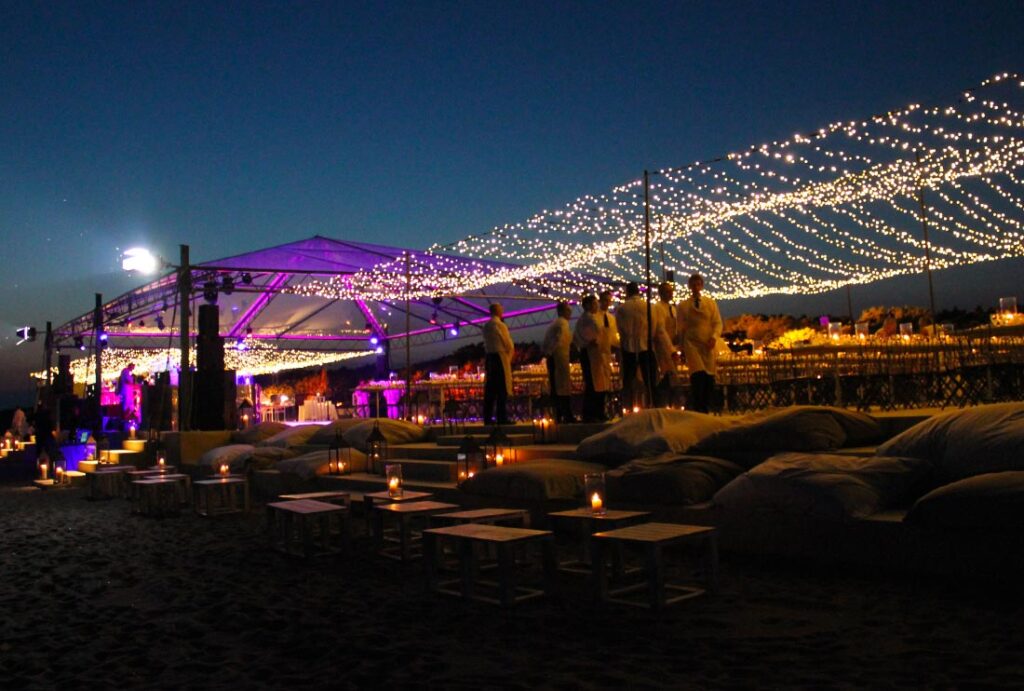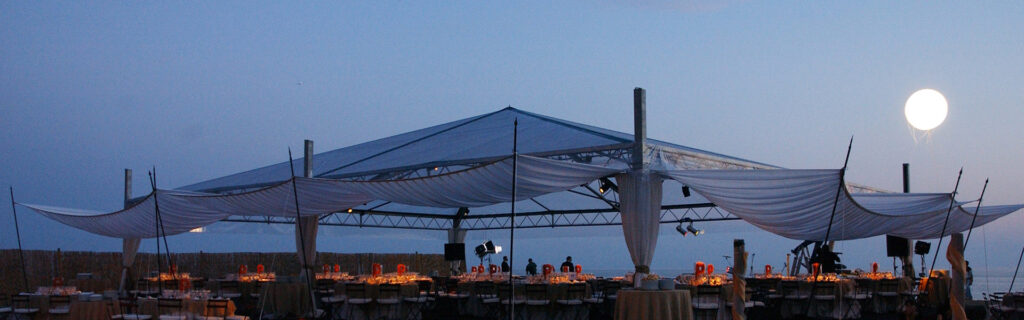 Sulla spiaggia di Capalbio, ad esempio, le tensostrutture permettono di creare spazi raffinati e leggeri, ideali per eventi esclusivi a pochi passi dal mare.